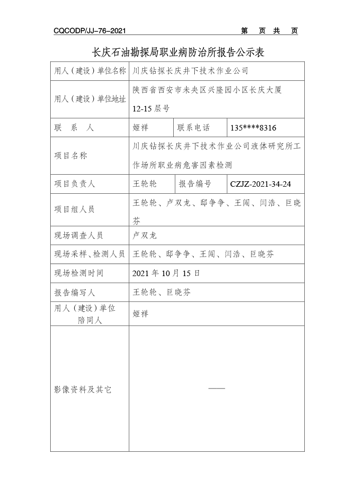【陕西】川庆钻探长庆井下技术作业技术公司液体研究所工作场所职业病危害因素检测报告CZJZ-2021-34-24