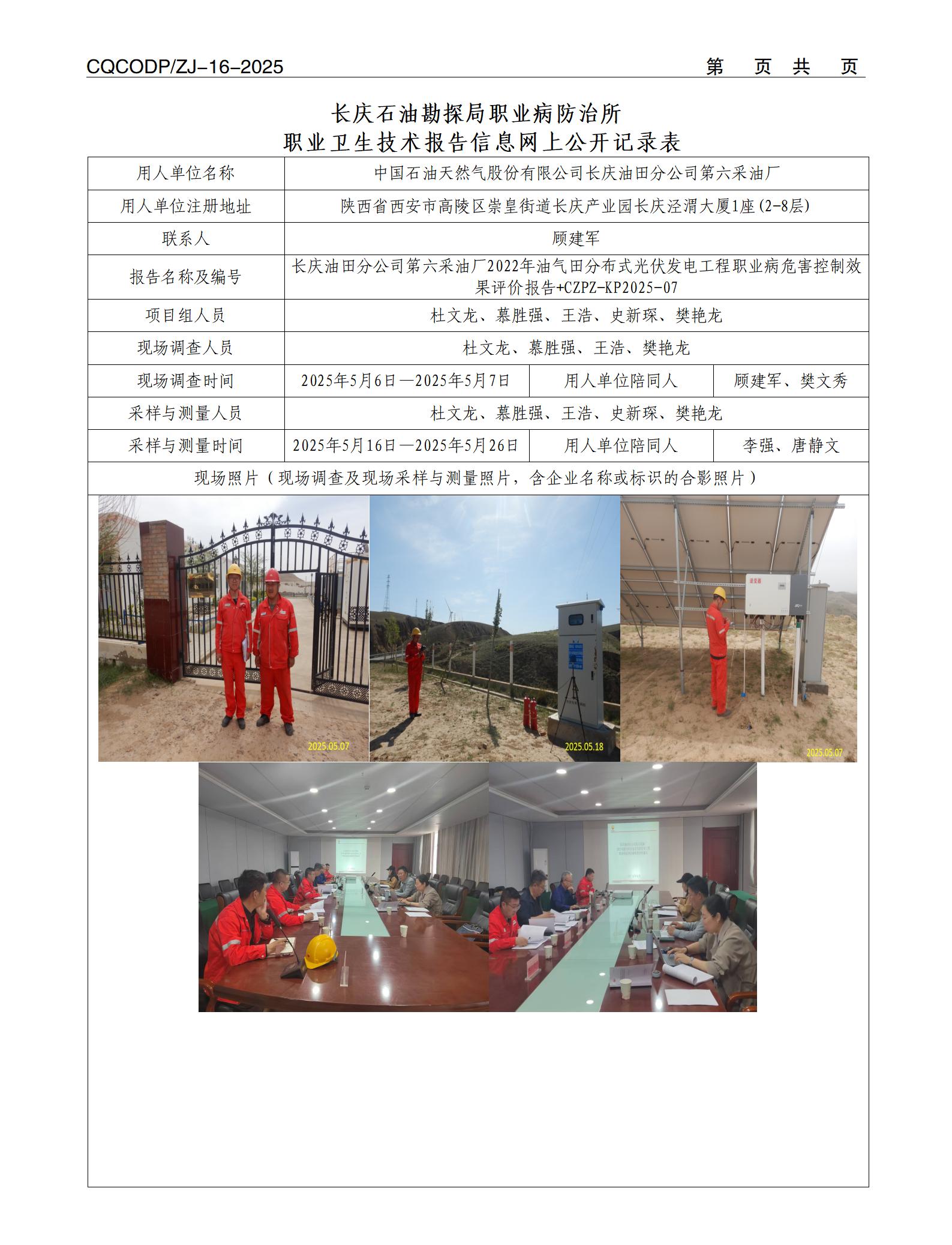 【陕西】长庆油田分公司第六采油厂2022年油气田分布式光伏发电工程职业病危害控制效果评价报告CZPZ-KP2025-07