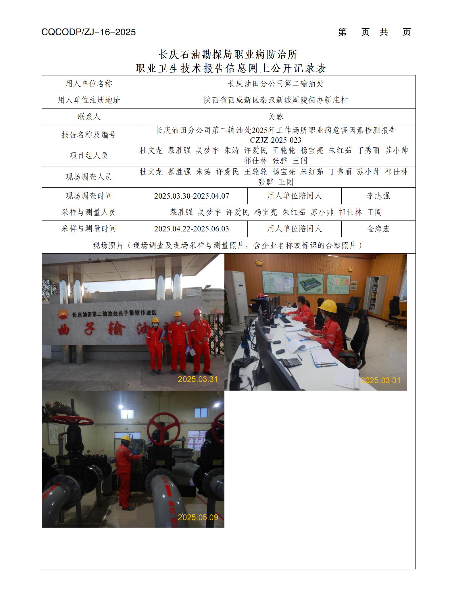 【陕西】长庆油田分公司第二输油处2025年工作场所职业病危害因素检测报告CZJZ-2025-023