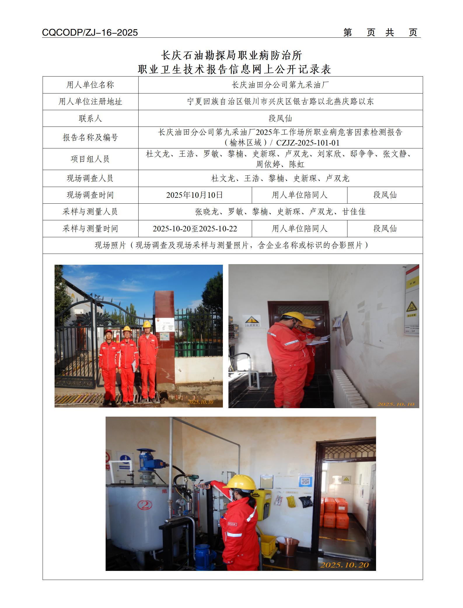 【陕西】长庆油田分公司第九采油厂2025年工作场所职业病危害因素检测报告(榆林区域)CZJZ-2025-101-01
