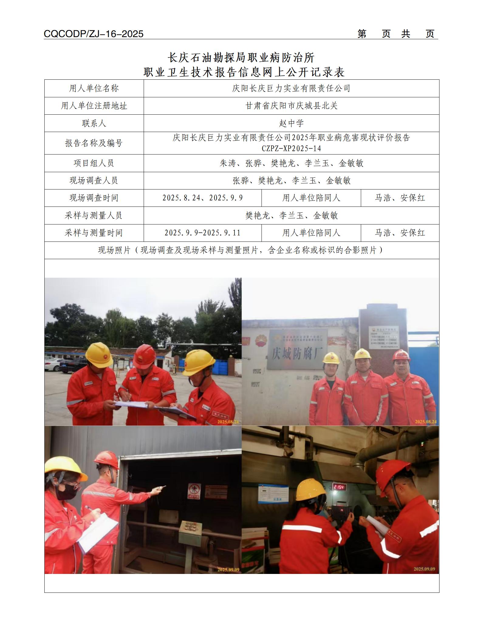 【甘肃】庆阳长庆巨力实业有限责任公司2025年职业病危害现状评价报告CZPZ-XP2025-14