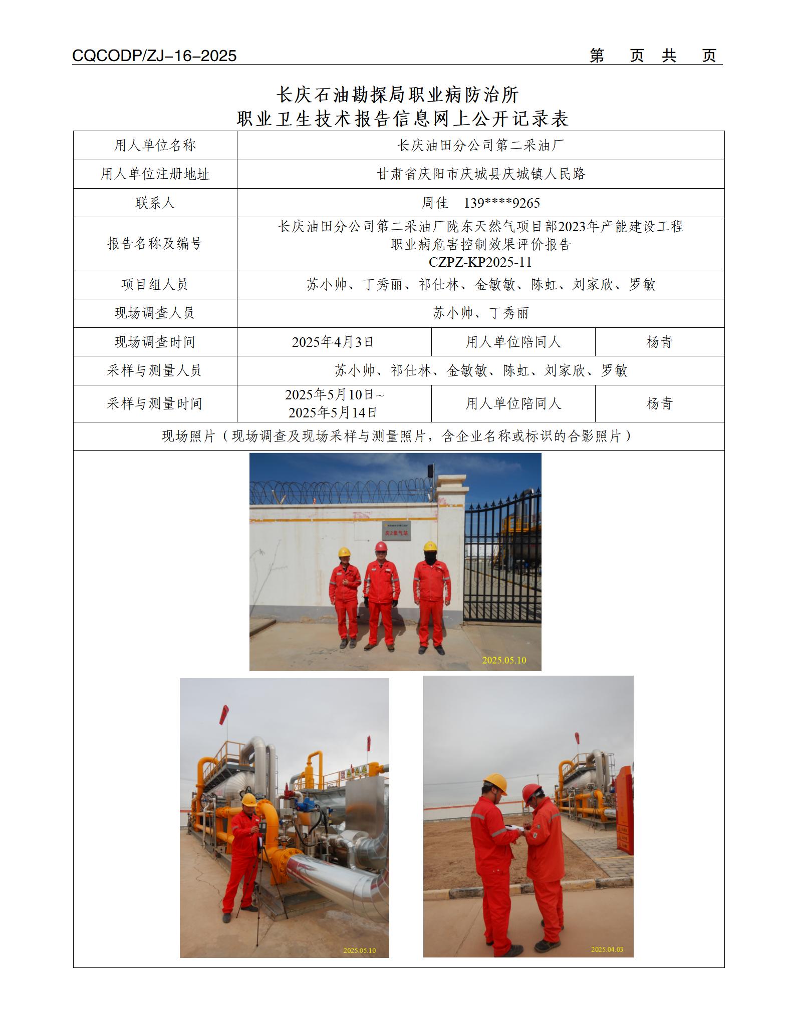 【甘肃】长庆油田分公司第二采油厂陇东天然气项目部2023年产能建设工程职业病危害控制效果评价检测报告CZPZ-KP2025-11