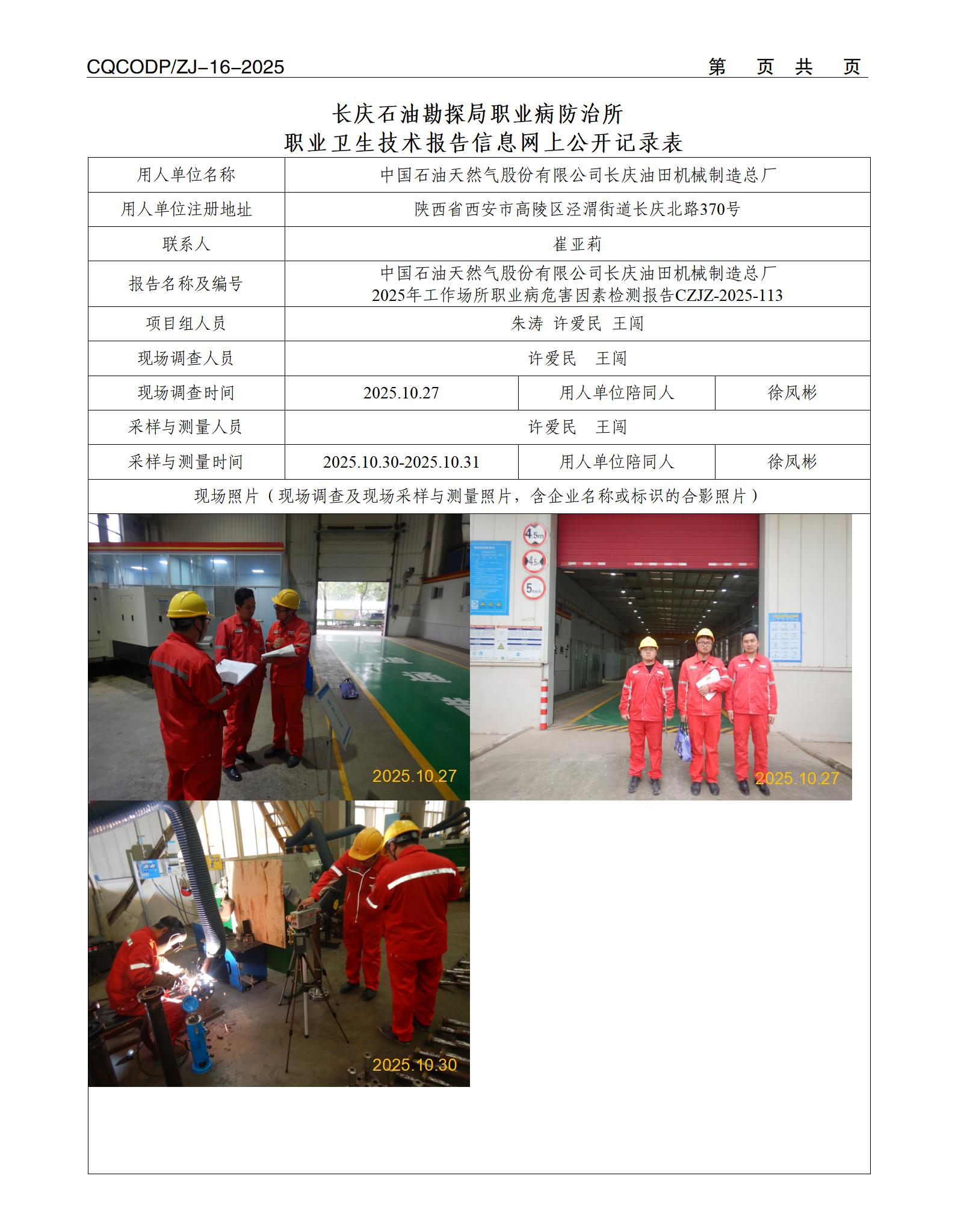 【陕西】中国石油天然气股份有限公司长庆油田机械制造总厂2025年工作场所职业病危害因素检测报告CZJZ-2025-113