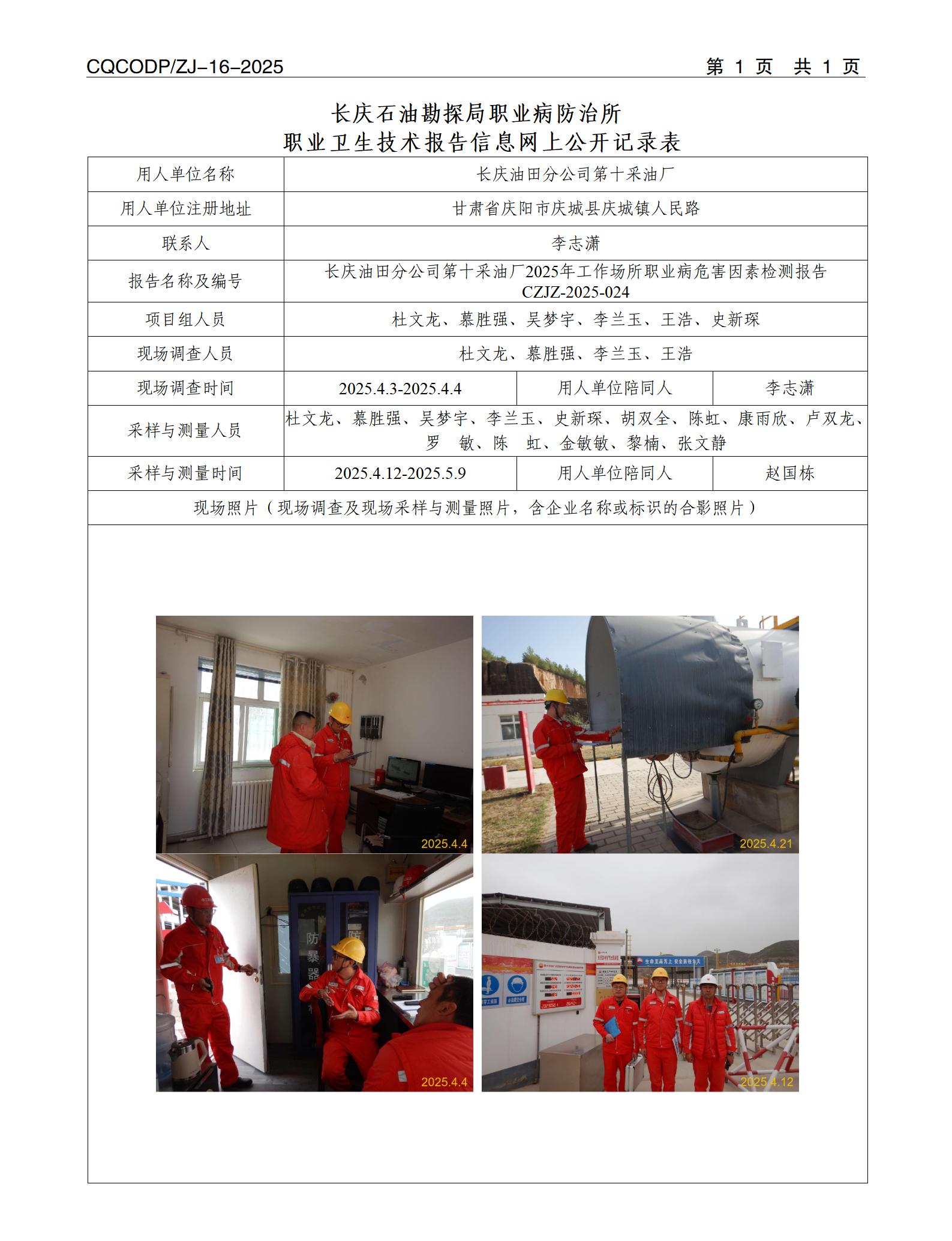 【甘肃】长庆油田分公司第十采油厂2025年工作场所职业病危害因素检测报告CZJZ-2025-024