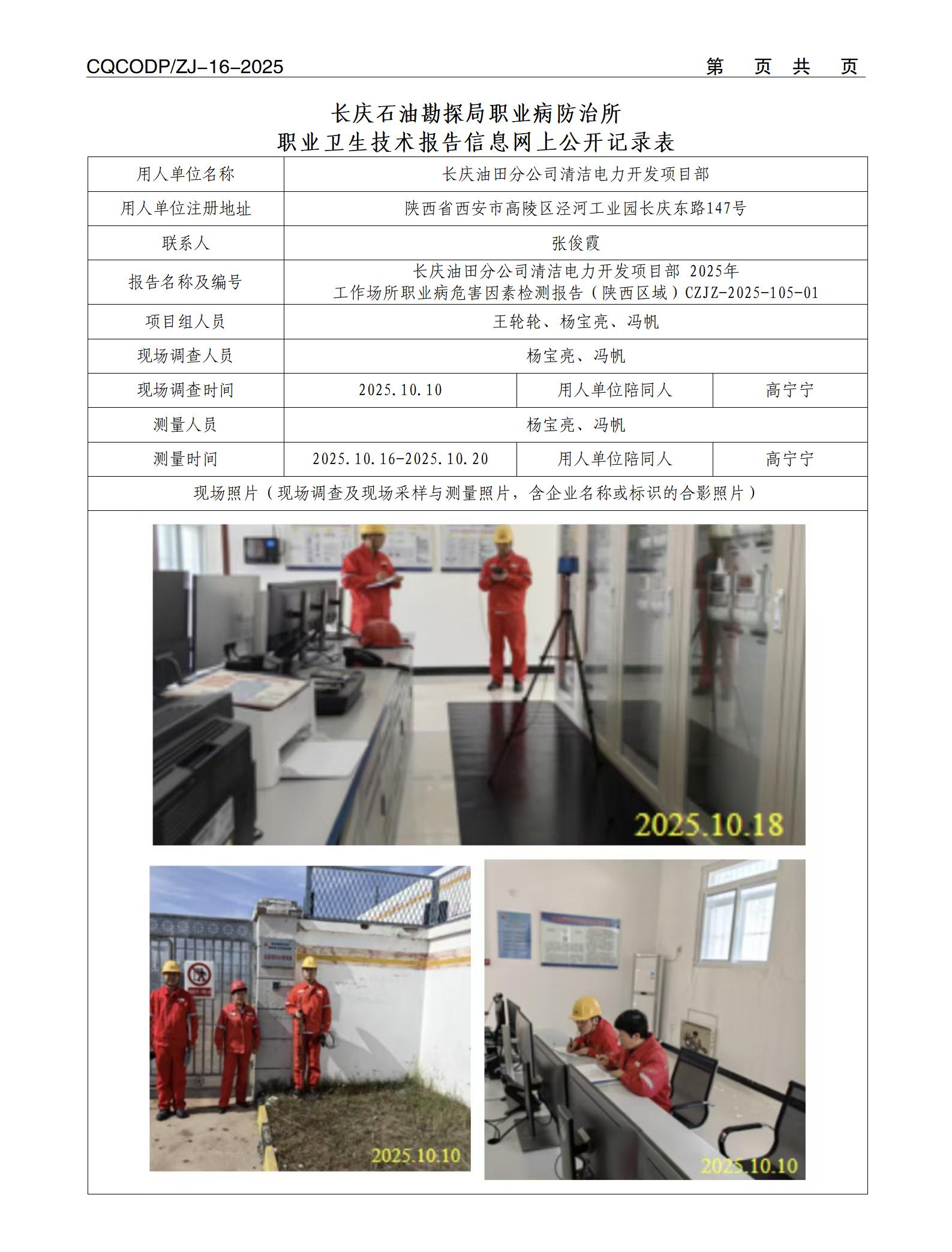 【陕西】长庆油田分公司清洁电力开发项目部2025年工作场所职业病危害因素检测报告(陕西区域)CZJZ-2025-105-01
