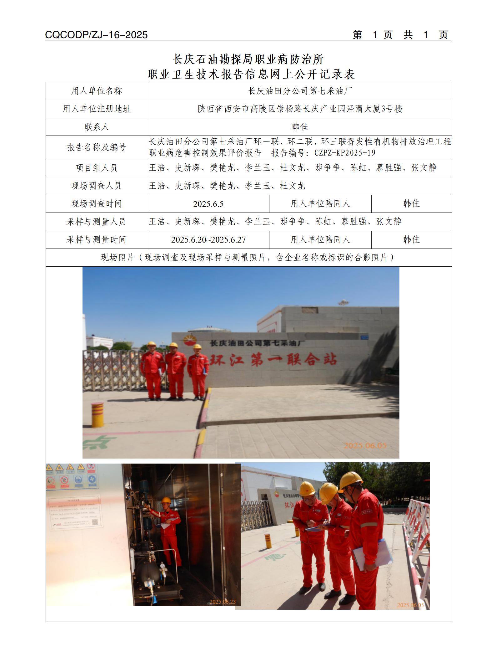 【甘肃】长庆油田分公司第七采油厂环一联、环二联、环三联挥发性有机物排放治理工程职业病危害控制效果评价CZPZ-KP2025-19