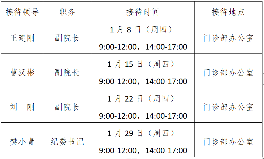 为深入贯彻落实党的二十大精神,坚持“以患者为中心”的服务理念,进一步提升医疗质量、医疗安全及服务效率,切实解决群众反映的各类问题,不断改善群众看病就医体验,按照医院《院长接待日工作制度》要求,现将2026年1月院长接待日有关事宜通知如下: