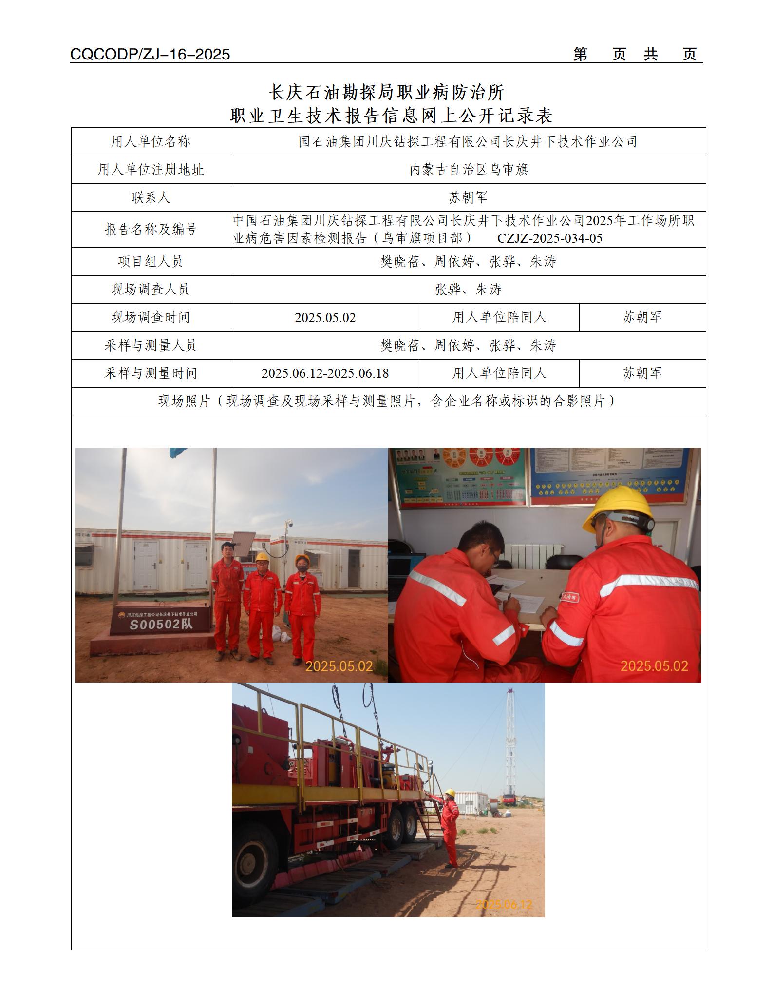 【内蒙古】中国石油集团川庆钻探工程有限公司长庆井下技术作业公司2025年工作场所职业病危害因素检测报告(乌审旗项目部)CZJZ-2025-034-05