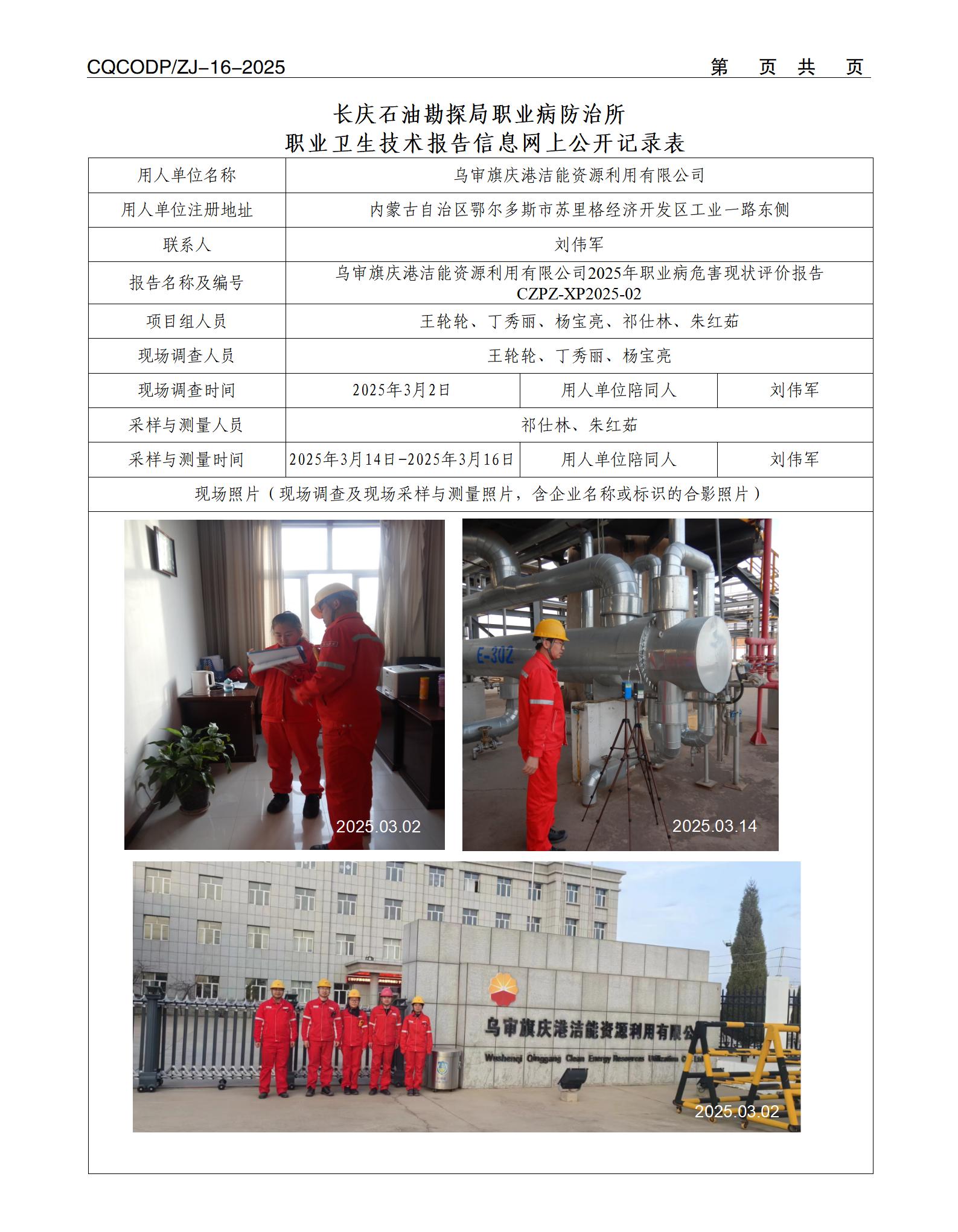 【内蒙古】乌审旗庆港洁能资源利用有限公司2025年职业病危害现状评价报告CZPZ-XP2025-02