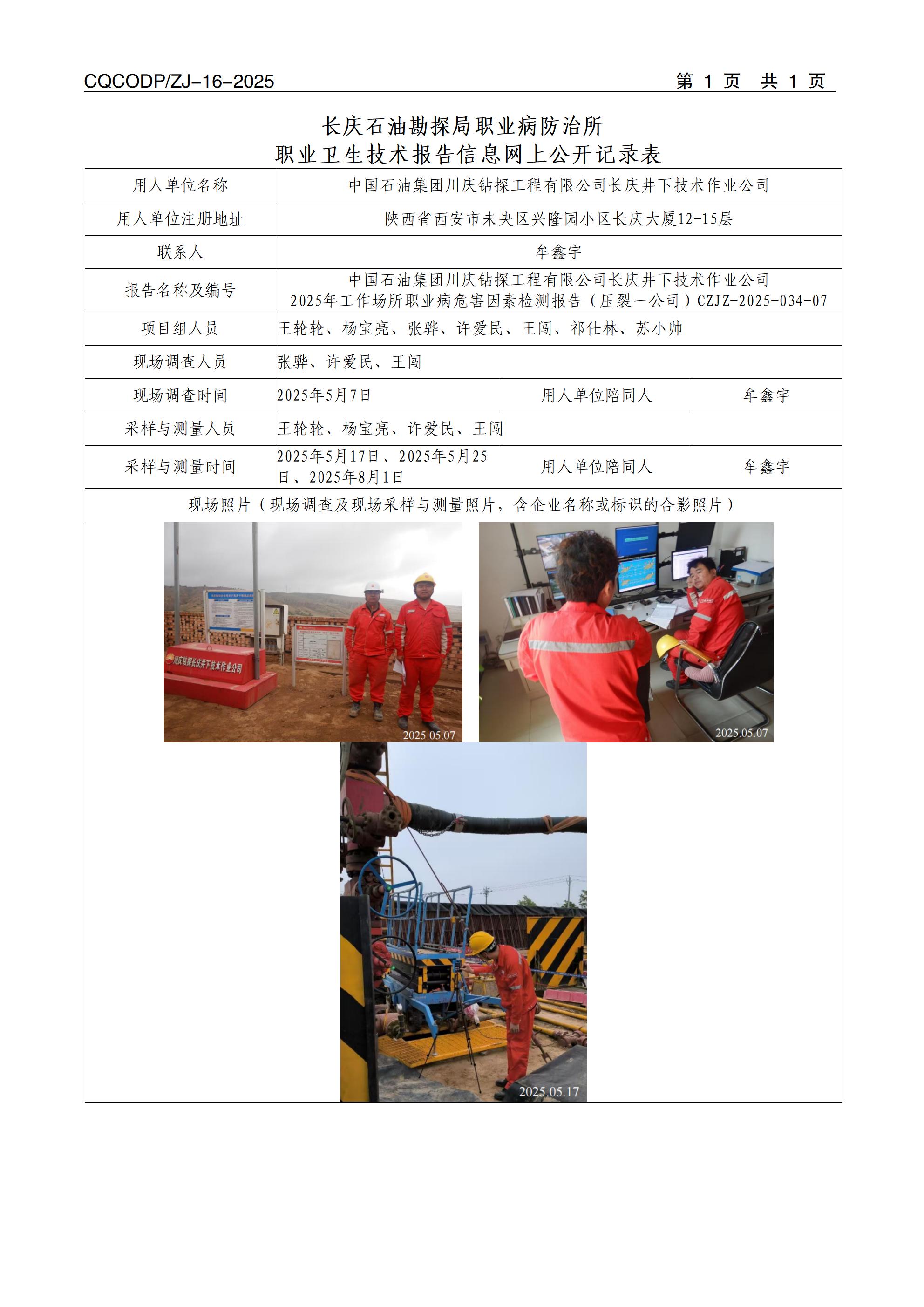 【甘肃】中国石油集团川庆钻探工程有限公司长庆井下技术作业公司2025年工作场所职业病危害因素检测报告(压裂一公司)CZJZ-2025-034-07