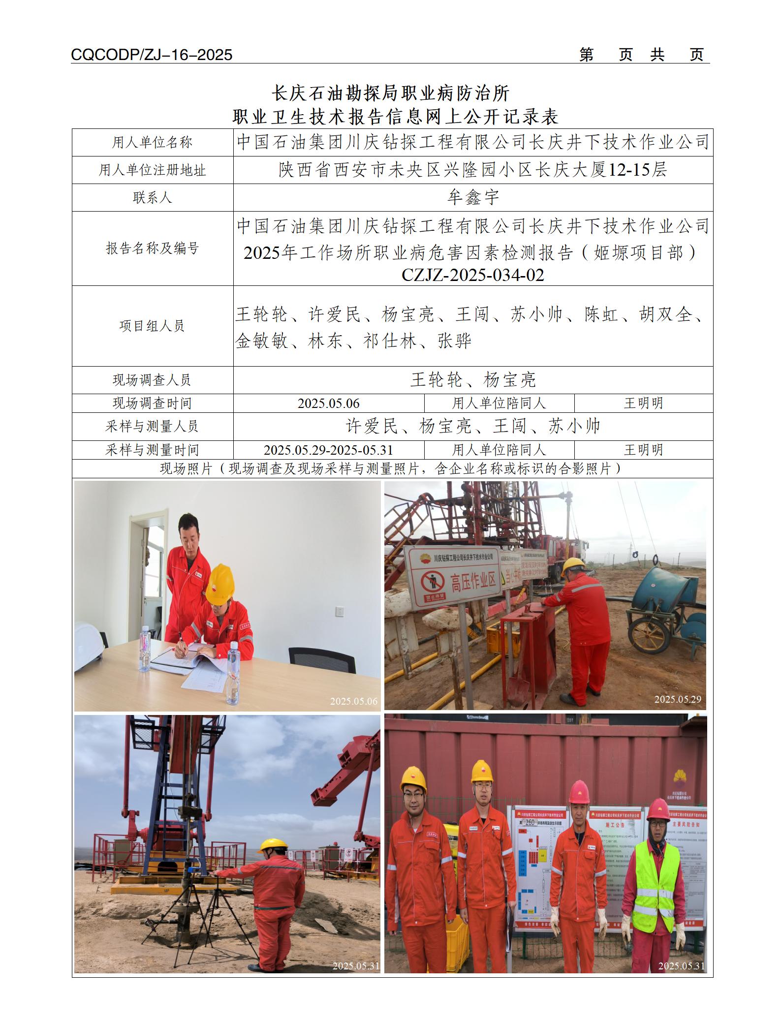【陕西】中国石油集团川庆钻探工程有限公司长庆井下技术作业公司2025年工作场所职业病危害因素检测报告(姬塬项目部)CZJZ-2025-034-02